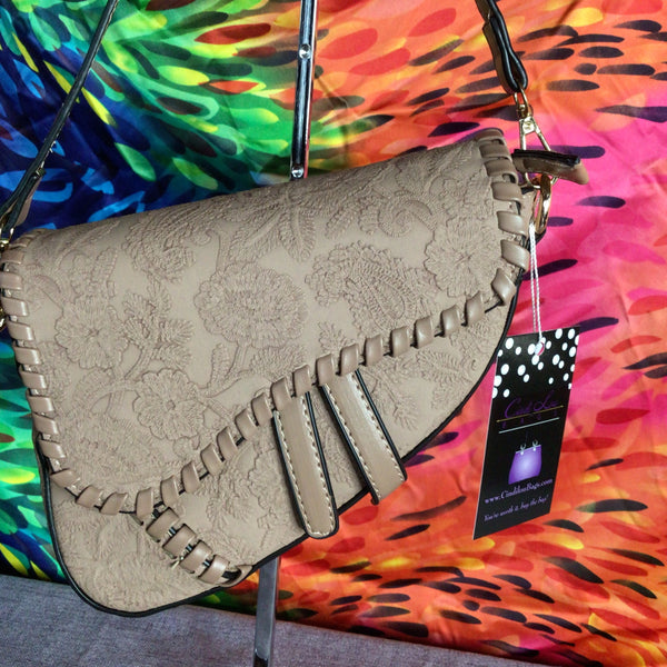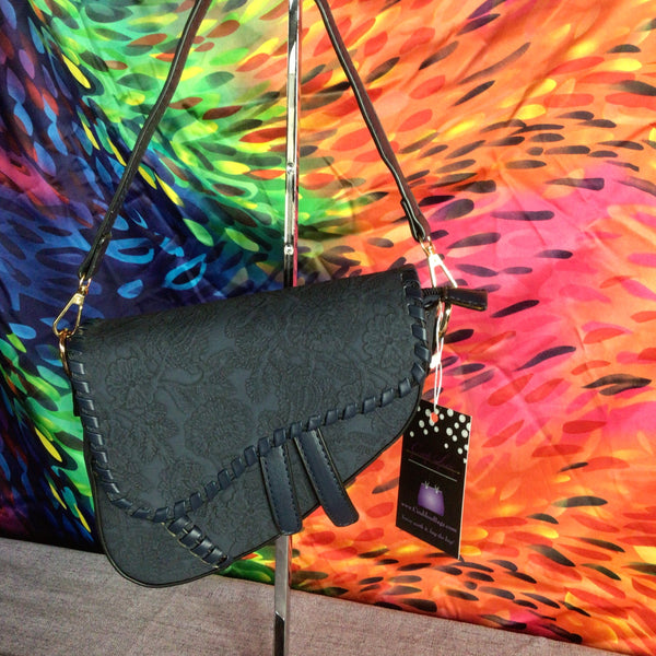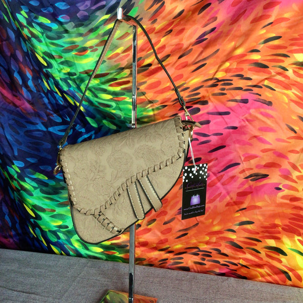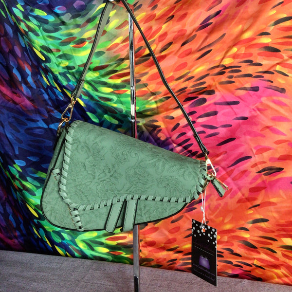 Veda is a cute shoulder purse that can also be a conversation piece. She comes with an additional longer shoulder strap. She is a textured bag with front snap closures. Her interior has slip and zippered pockets.